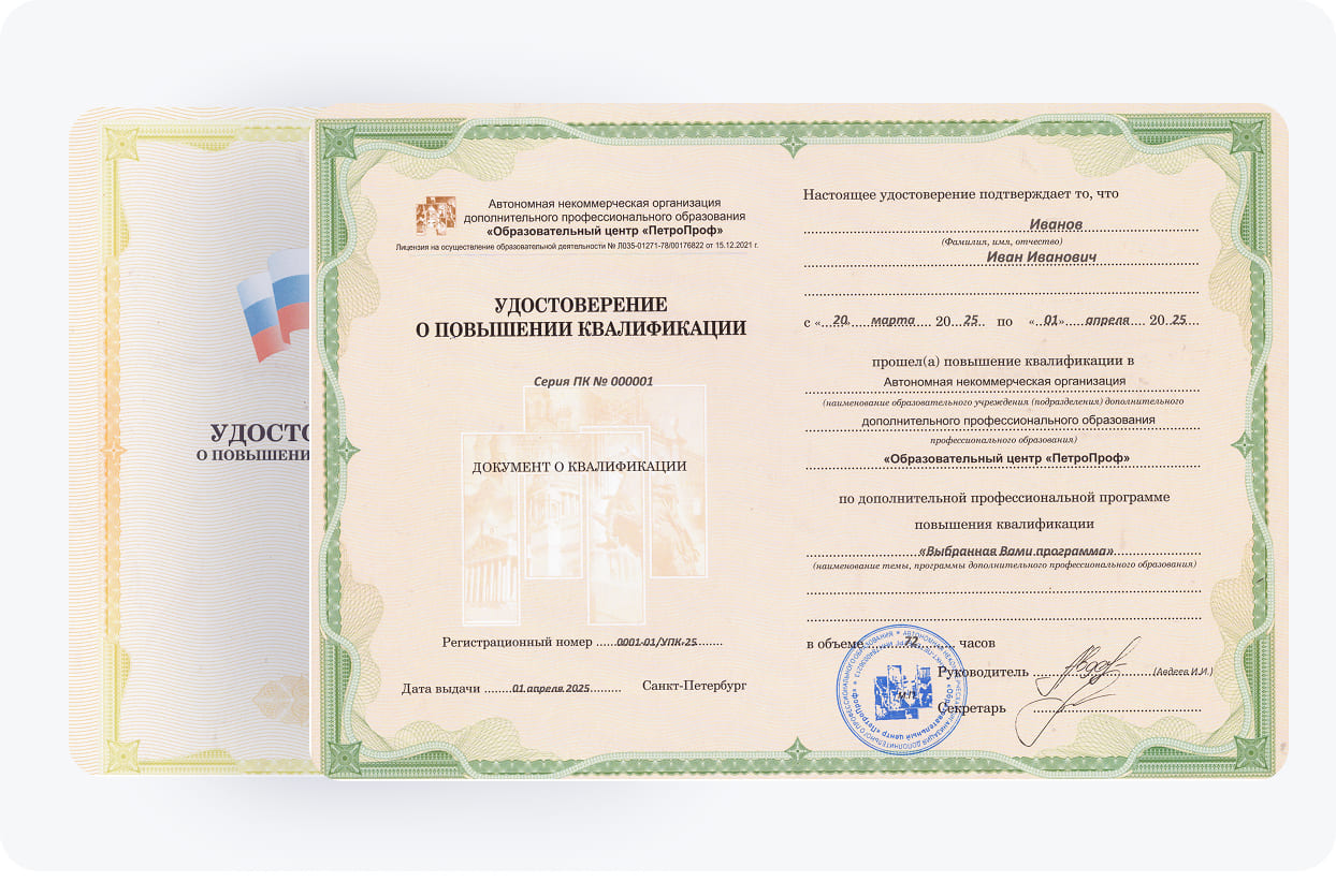 Завершив учебу у нас, слушатели получают удостоверение о повышении квалификации (УПК). Документ подтверждает наличие необходимых компетенций и позволяет специалистам подтвердить свою квалификацию перед работодателями и партнерами. Учебный центр «ПетроПроф» обладает всеми необходимыми лицензиями и аккредитациями, гарантирующими высокое качество предоставляемых услуг.